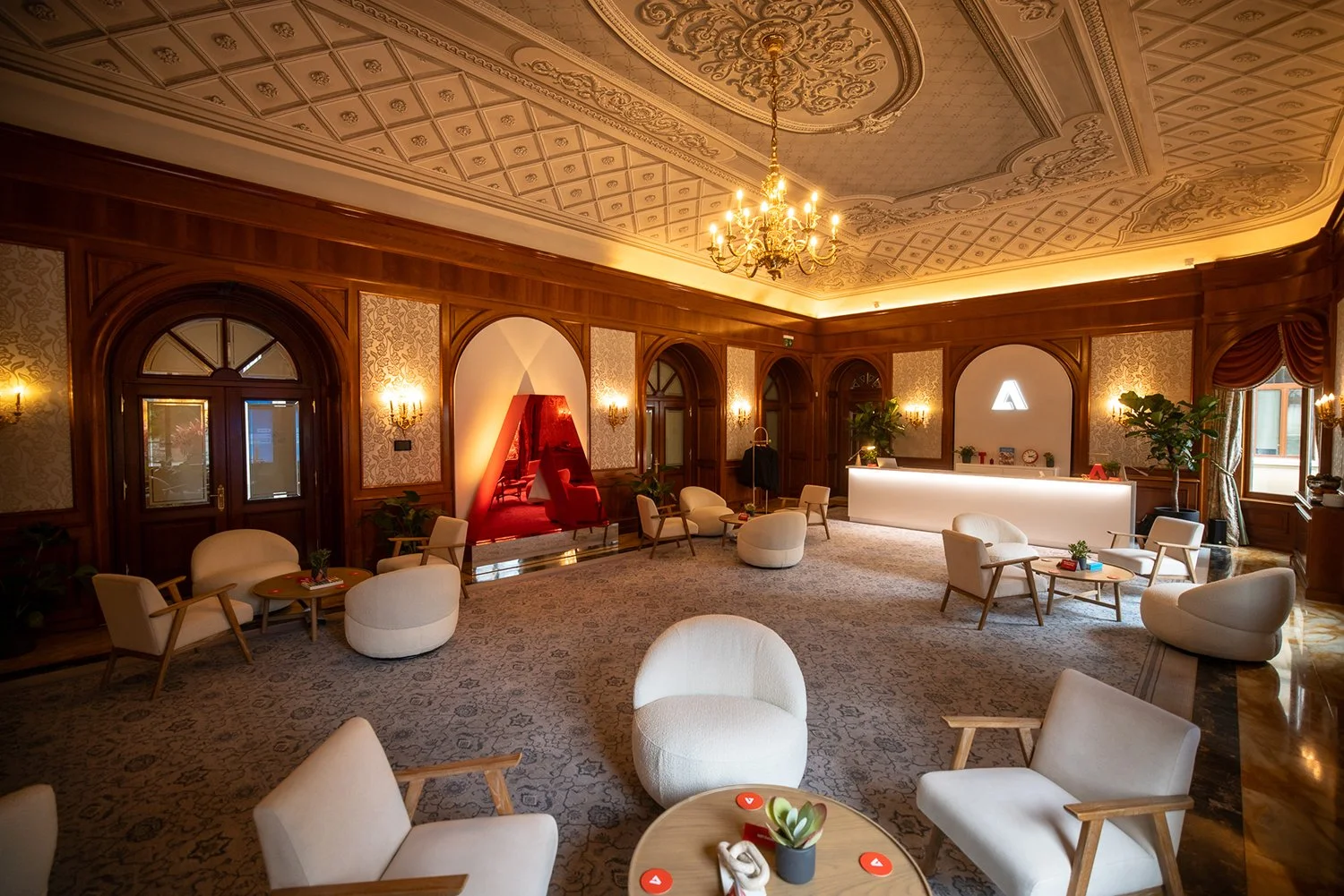 Working within the historic Beau-Rivage Palace presented an immediate challenge: how to honour the venue's Art Nouveau and neo-baroque architecture while establishing Adobe's clean, contemporary brand presence. Rather than competing with it, the approach centred on collaboration - a partnership using restraint and precision to create spaces that felt both refined and dynamically responsive.
